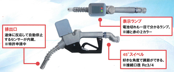 | 自重落下でポンプなしでも満タン時に止まる! 独自のセンサーを内蔵した電池式オートストップノズル ![]() ■特長 ●粘度1,500cpまでの液体をオートストップ ●液体を無駄なく排出可能 ドラム缶内の残液は深さ約5mm(約200㏄)程度 ●連続運転が可能 ![]() ■仕様