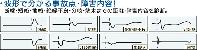 事故点までの距離・ケーブルの障害内容が分かります。![]() ■特長 ●ボタン一つでケーブル長と事故点までの距離を測定 ●波形で分かる事故点・障害内容! ●電力・同軸・通信・制御などあらゆる線に対応 ●端末は機器接続・解放・短絡でも計測可能 ●PCにUSB接続して測定結果の管理や印刷が可能 ●波形画像をパソコンの画面にリアルタイムで表示 ●経済的で便利な充電式です(充電器付) ●配線路探索用トーン発信機能(プローブ別売) ![]() ![]() ![]() ■よくある質問 Q:TDR法とはなんですか? A:TDR(Time Domain Reflectmetory)とは日本語で【時間領域反射率測定方式】となります。 ケーブルにパルスを送り、そのパルスが戻ってきた際の波形と時間によって、事故点の状況やケーブルの全長(事故点がある場合は事故点までの距離)を求めることができます。 (FC200Sの場合はケーブル長の数字とオープン/ショートの状態が表示されます) Q:この製品が使用できる条件は? A:①ケーブルに電圧がかかっていないこと(無電圧状態であること) ②ケーブルに二芯以上の芯線があること(同軸の場合は芯線と外部導体) Q:対応できるケーブルは? A:2芯に接続が可能な状態のメタルケーブルであれば使用可能です。(一部例外有り) Q:ガスダム等が存在する場合でも測定はできますか? A:測定は可能でございますが、ガスダムより先の障害診断・測長はできません。 TDRで測定した際には、ガスダムの地点で上向きの波形が表示されます。