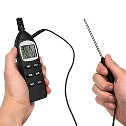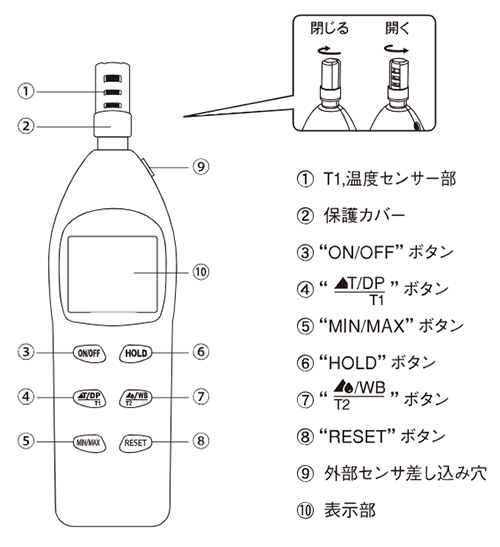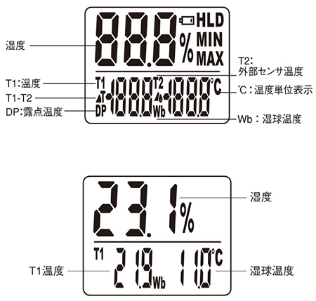 周囲環境温度、乾球温度、湿球温度、露点温度の4つと湿度測定可能なデジタル温湿度計。![]() ■特長 ●付属のプローブセンサーを使っての温度測定も可能です。 ●測定値を固定表示するHOLD機能付き ●MAX(最大値)/MIN(最小値)メモリ機能付き。 ●オートパワーオフ機能付き。(最終ボタン動作から一定時間動作がない場合には自動的に電源が切れます。解除可能。) ![]() ![]() ![]() ■製品詳細 ●各部名称 ![]() ●画面表示例 ![]() ■仕様
