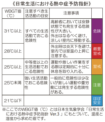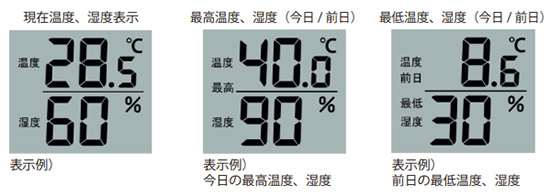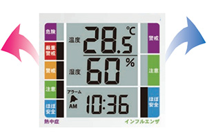 | ●熱中症の予防に 熱中症暑さ指数をWBGT値およびバー5段階で表示 設定したWBGT値でアラームを鳴らす警報機能付 休息や水分補給の目安に ●季節性インフルエンザの予防に 季節性インフルエンザ指数を絶対湿度およびバー3段階で表示 温度調整や加湿の目安に ●最高、最低値を表示 今日と前日の最高温度・湿度、最低温度・湿度を表示 ![]() ■製品概要 ![]() ●熱中症計 WBGT値に基づいた5段階の警報度をバー表示 ![]() ●インフルエンザ指数計 絶対湿度に基づいた3段階の警報度をバー表示 ![]() ●現在温度、湿度表示と最高値・最低値表示 現在の温度、湿度を表示します。 ボタン操作により、今日および前日の最高最低値を表示することができます。 ![]() ■仕様