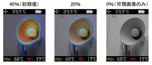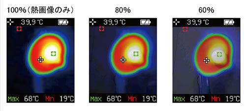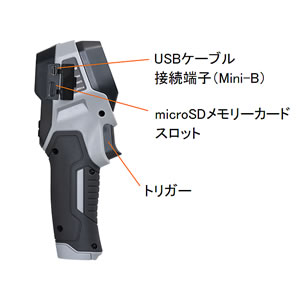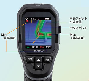 | 熱画像と可視画像を重ね合わせて表示できるサーモカメラです。 容易に温度分布を確認でき、位置の特定や異常温度の素早い検出に役立ちます。 設備や機器の異常確認、電子基板の温度分布把握、住宅、器具、衣服などの断熱や保温性の確認に最適です。 ![]() ・本製品は工業用のため体温は測れません。ご注意ください。 ・本製品は「輸出貿易管理令に対する該非説明書」の発行に対応していません。 ■重ね合わせ機能 熱画像(赤外線センサ)と可視画像(イメージカメラ)を重ね合わせて表示します。 重ね合わせの割合は6段階で切り替えができます。 容易に温度分布を確認でき、異常温度の素早い検出に役立ちます。 ![]() ![]() ■3点の温度表示 最高、最低、画面中央の3点の温度値を表示します。 各々の測定箇所は、液晶部にマークで表示します。 ![]() ■microSDメモリーカード保存 本体部のトリガーを押すと、測定画面をmicroSDメモリーカードに保存します。 保存した画像は、キー操作で表示可能です。 ■パソコン転送 microSDメモリーカードに保存した画像は、USBケーブル(標準付属)でパソコンへ転送可能です。 ■オートパワーオフ機能 最後のボタン操作から設定時間が経過したとき、自動的に電源OFFにすることができます。 1分、2分、5分、10分、OFF の5種類から設定できます。 ■放射率設定 測定対象物にあわせて放射率を設定できます。 任意設定の場合は、0.01~1.00の範囲で0.01単位で設定可能です。 ■日時設定 現在の日付と時間を設定することができます。 設定値は保存画像のファイル名に反映されます。 ■液晶部 ![]() ■側面 ![]() ■収納ポーチ ![]() ■仕様