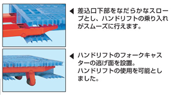 頑丈で長持ち、業界最軽量、スベリ止めゴム付き、ハンドリフトに適応 ![]() ■特長 ●ハンドリフト作業向上の為、乗り上げ角度及びピッチ、孔幅を小さくし、ハンドリフトが乗り上げ やすい様に設計。また、乗り上げ部に突起を設置し一層作業性を良くしております。 ![]() ■寸法図 ![]() ■仕様