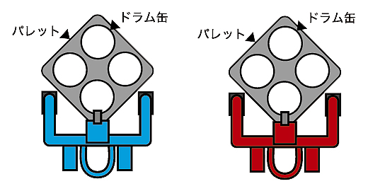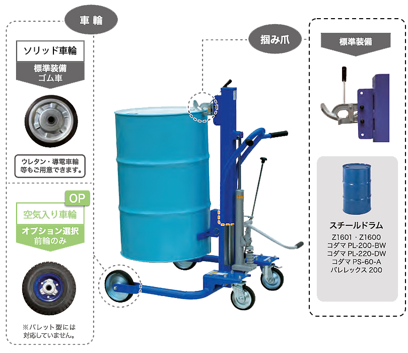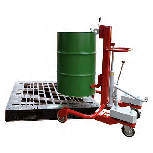 | ■特長 ●ドラム缶の運搬、積み下ろしを軽快に、スピーディーに!ドラム缶を簡単にクランプし、安全に運搬する為に開発されました。 ●ドラム缶の縁に掴み爪を押し当てると自動的にチャッキングします。安全で簡単な油圧足踏みリフトです。 ![]() ●足踏み油圧式シリンダーで任意の高さまでリフトアップすることが可能です。 ![]() ●パレット型は、ドラム缶をパレットの上に積載したり、パレット上のドラム缶をチャッキングして運搬することが可能。 ![]() タイプ
