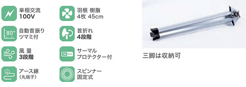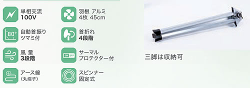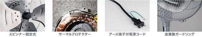 | ●樹脂製・アルミ製4枚羽根のスタンド扇。全閉式モーターを採用しました。 ●サーマルプロテクター(復帰式過熱保護装置)内蔵でモーターを過負荷や異常電流から保護します。 ●左右約80度、自動首振りします。 ![]() モーターコイルが密閉されており、内部にチリやホコリ等が侵入しにくく、工場等の油気・油煙の多い場所でも保守性・信頼性の高いモーターです。 ●スピンナー固定式で脱着簡単 羽根は手で取り付けられるスピンナー固定式を採用。脱着がしやすくお掃除も簡単です。 ●異常過熱も検知する安心設計 モーターの異常過熱を感知し、自動的に回路を遮断します。 ※正常温度に戻ると自動的に復帰します。 ●電源コード長さ3.0m 従来品の2.4mから、より広範囲での使用ができるように長さを3.0mへ改良しました。 全機種アース端子付き。 ※対応機種:OPF-45SZ、OPF-45SAZ、OPF-45FAZ ●金属製ガードリング採用 全機種、堅牢で丈夫な金属製ガードリングを採用。リングの割れを防ぎ、不意の危険を回避します。 ![]() ■羽根タイプ ●耐久性に優れたアルミ製羽根 過酷な環境にも耐えるアルミ製羽根を採用。樹脂製に比べ蒸気や油 煙の多い環境でも安心してご使用いただけます。 ハードな現場に快適環境をお届けします。 ●優しい音質の樹脂製羽根 アルミ羽根と比べ風切り音が優しく、倉庫や体育館等様々な空間での 使用に適しています。 ![]() ■安全性、使いやすさを考えた様々な機能 ![]() ![]() ![]() ■タイプ ●全閉式スタンド工場扇(45cm)/品番 ME1PF-45SZN ![]() ![]() ■全閉式アルミ羽根スタンド工場扇(45cm)/品番 ME1PF-45SZN-A ![]() ![]() ■寸法図 ![]() ■仕様