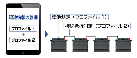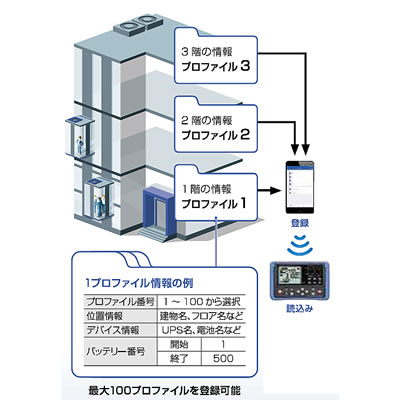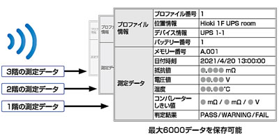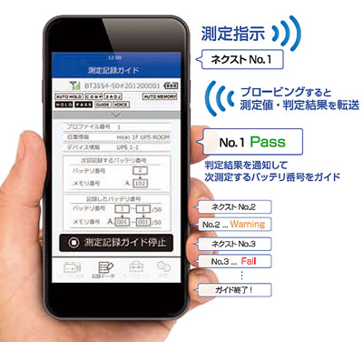 ■事前に現場情報を登録 測定現場ごとのプロファイル情報を登録し、本体に読み込みます。 ![]() ■測定順を音声でガイド プロファイル情報に沿って、バッテリーの測定順を音声出力します。 測定順のミスを防ぎ、測定結果も音で確認できます。 ![]() ■劣化診断以外のアプリケーション 電池の接続抵抗値も一緒に管理 測定用途ごとにプロファイル情報を設定することで、同じ電池の各測定データを簡単にまとめて管理できます。 ![]() ■UPS周辺の点検データも一緒に管理 弊社クランプメーターなどで測定した各種データも、一元管理できます。 ![]() ■プロービングと同時に自動記録 コンパレータしきい値に対するPASS/WARNING/FAILの判定結果や測定値を本体に記録、スマホに転送します。 ![]() ■楽々データ管理 プロファイル情報に関連付けて測定データを保存します。 測定したバッテリーの管理工数を低減できます。 ![]() ■UPS稼働状態でも測定できる耐ノズル性 ![]() ■管理・解析アプリ ![]() ■アプリ・ソフトウェア機能 ●楽々レポート作成 アプリ上で帳票形式のレポートを作成できます。 撮影した現場写真も一緒に管理できます。 ![]() ●蓄積データをトレンド表示 選択したバッテリのデータ表示やキュービクル分(最大500個)のトレンドグラフの生成ができます。 ![]() ■セット内容