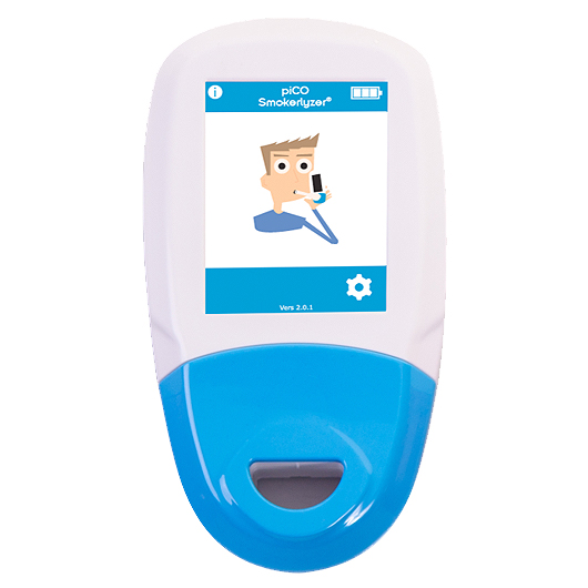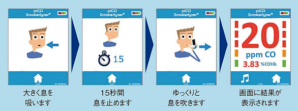 | 本機器は喫煙者の呼気中に含まれる一酸化炭素(CO)濃度を測定する機器です。 禁煙プログラムや禁煙指導において、喫煙者の呼気COを測り、喫煙レベルの指標として使用することを目的としており、禁煙維持への患者の動機づけに有用です。 測定されたCOは100万分の1単位(ppm)で測定され、それに相当する血液中のカルボキシヘモグロビン(以下、COHb)がパーセントで表示されます。 ※非喫煙者の呼気を測定するための機器ではございません。 ![]() ■特長 ●タッチパネル対応のカラーディスプレイ タッチパネル対応のカラーディスプレイを搭載しており、直感的に操作ができます。 また、測定結果が喫煙レベル別に異なる色で表示されるため、患者さんにも結果をしっかり伝えることができます。 ●軽量・コンパクト 成人の片手に収まるコンパクトサイズ。単三形 アルカリ乾電池3本で駆動するため、特定の場所に限らず使用が可能です。 ●感染予防に配慮 Dピースやステリブレスマウスピースは交換でき、感染対策に配慮した設計です。 ![]() Dピース: ・逆流防止弁を搭載。 ・バクテリアろ過率99.9%以上のフィルターを搭載 ・1ヶ月に1回交換。ただし、感染の疑いのある患者に使用した場合は都度交換。 ステリブレスエコマウスピース: ・1本ずつ個包装使用のため清潔にDピースに接続可能 ・1検査ごとに交換 ●アニメーションによるシンプル操作 表示されるアニメーションに従って操作することで、スムーズな測定が可能です。 ![]() ●メンテナンスサポート体制 本機器は年に1度のメンテナンスが必要です。定期メンテナンスを行う事で測定精度を維持し、長期間機器をご使用いただくことができます。 校正作業:1年毎 センサー交換:5年毎 ■一酸化炭素(CO)が体に及ぼす影響 COは、有機物質が不完全燃焼する際に発生する、無職、無味、無臭の有毒ガスです。 COを吸い込むと、体内に酸素を運ぶ血中ヘモグロビンと結合してカルボキシヘモグロビン(COHb)を形成し、酸素を運ぶ機能が低下します。 体内の酸素が不足すると、息切れしやすくなる他、体内組織の回復や再生など、日常生活に影響を及ぼします。 ■タバコが引き起こすニコチン依存症 紙巻タバコや加熱式タバコには、ニコチンという物質が含まれています。 ニコチンを吸い込むと、脳内でドーパミン(快楽を感じさせる物質)が放出され快楽を感じます。 ニコチンは、最短で30分後に体内から消失し始め「イライラ」したり、「集中力が切れる」などの症状が始まり、再度ニコチンを取得したくなります。 これをニコチン依存症と呼び、喫煙者自身の意志だけでタバコをやめることが困難になります。 ■仕様