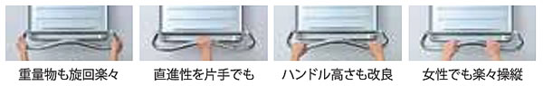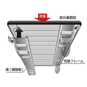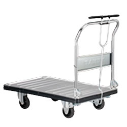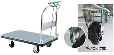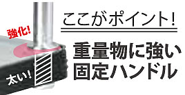 縦方向の梁、横方向の絞りで強度、耐久性が優れているフレーム構造だから強い![]() ■太いパイプがフレームを通っており、かつフレームも根元を強化しているので長く使用してもグラつきにくく重量物に強い構造 ![]() ■全周ゴム リベット止めで人に対する安全性 ■高品質メッキ 採用しているユニクロメッキは錆びに強く長期間の使用に十分な耐久性 ■最強強度のフレーム構造 独自の絞りを加えた肉厚フレーム&梁(補強板)を溶接することで上から荷重をガッチリ支えるので、頑丈さが違う。 ![]() ■人間工学で疲れにくく扱いやすい操作性 スラローム走行も片手でも扱い易く疲れにくい、しかもハンドル高さが現代人に合わせて少し高くて押しやすい、ユニバーサルデザインハンドル ![]() ■固定ハンドルは特にグラつきにくい支柱構造 固定ハンドルはフレームを支柱が通るような構造のため長期間使用してもグラつきにくいので人気商品です。 ■ギアブレーキ 高いブレーキ性能。車輪についたギアで車輪自体の回転をロック ![]() ■エアポートブレーキ ギアブレーキより安価 空港用カートと同じ機構。車輪に食い込ませて止める。導入しやすい。 ![]() ■タイプ/寸法 寸法( )内は150mm (6インチ車輪)仕様です。
