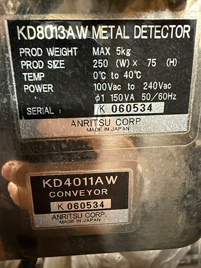 中古防水アンリツコンベア式金属探知機(通過高さ75mm×通過幅300mm)/品番 KD8013AW
