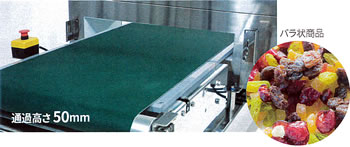 通過高さ50mmから400mmまで幅広くラインナップし、シート状の物やバラ状の商品から、大きな箱·袋まで、高感度に検査することができます。