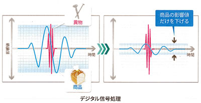 被検査品(商品)と金属異物の影響値を分離し、商品の影響値だけを下げるデジタル信号処理(特許申請済)により、優れた実用感度を実現しています。