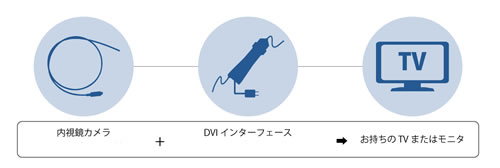 ※2:Windows10の場合はWindows内蔵標準アプリの「カメラ」で動作可能(保存機能付き)。その場合、インターフェースの保存ボタンは使用不可能。 <DVIインターフェース M1129KT-DVI18S> ●カメラを一般のハイビジョンTVにつないでお使いいただけます。極細内視鏡の映像をハイビジョンTVの大画面でご覧ください。 ●DVI出力で一般のTVまたはモニタに出力可能 (DVI→HDMI変換ケーブルを使ってHDMI端子付きのTVに接続可能) ![]()