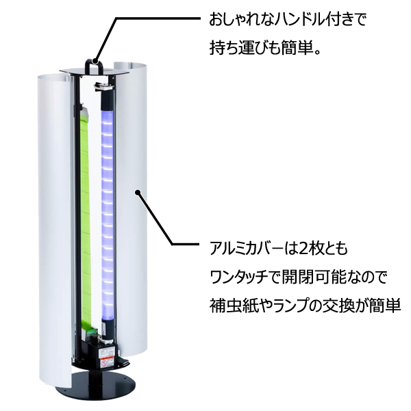 | 当商品は補虫ランプで虫を誘引し、粘着テープで捕獲するタイプの捕虫器です。 カバーを閉じた状態でご使用いただけるため、捕獲された虫が外から見えることはありません。 そのため、店舗や商業施設など人目の多い場所でも、お客様に不快感を与えることなく安心してご利用いただけます。 カバーの色は3種類からお選びいただけます。 ![]() ■特長 ●蛍光灯タイプの約半分の消費電力(30W⇒16W)。もちろん捕獲力も抜群です。アルミカバー側面と上面のスリットから効率よく虫を誘い込みます。 ●光源寿命は30,000時間(蛍光灯の約6倍) ランプ交換によるゴミを減らすことができます。廃棄物処理費用の削減にもつながります。 ![]() ●ランプ交換によるゴミを減らすことができます。廃棄物処理費用の削減にもつながります。 ●性能の異なる2タイプの捕虫紙で羽虫を大量捕獲 メーカー独自のネバネバ粘着剤で強力に虫を捕獲する「専用捕虫紙」と、反射性能の高い「専用大型反射捕虫シート」とで、寄せつけた虫を逃しません。 ![]() ●自立式フロアスタンド型なので、工事不要でどこでも設置可能 ![]() ■用途 洗練されたアルマイト処理が美しく、上質な空間でも違和感のないデザインです。飲食店や美容院、病院、ホテル、大型スーパーマーケットなど幅広い業種で採用されています。 ![]()