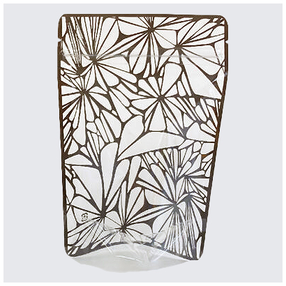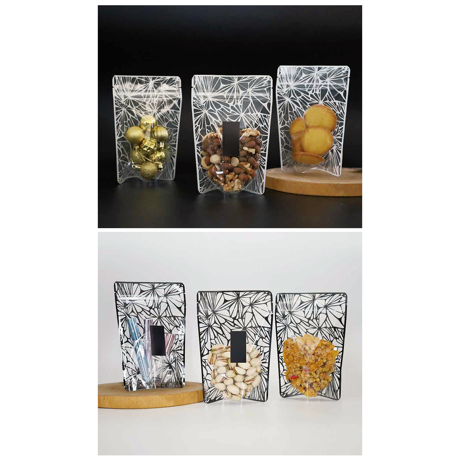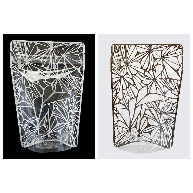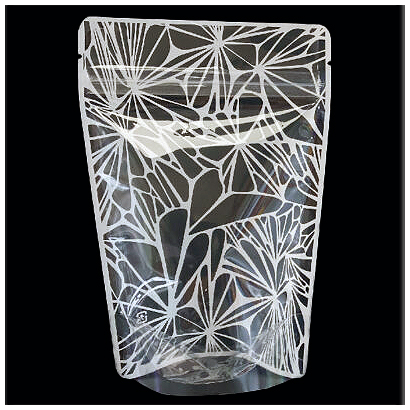 | ■特長 ●大人な模様が目を引くスタンド袋、表面は透明なので中身を邪魔しません。 ●サイズは巾120mm、高さ180mmの1サイズ ●白と黒の2種類をご用意。