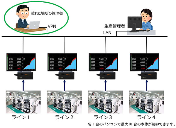 | 生産状況表示・生産進捗管理システム ■「生産現場の⾒える化」は現場改善の第⼀歩です ![]() ●生産状況をリアルタイム表示 現在の生産状況、出来高折れ線グラフ、汎用入力端子の状態のそれぞれを切り替えて表示する事が出来ます。 またグラフ表示のカスタマイズも別途ご相談承ります。 ●稼働分析用データ出力 生産中や入力信号による機械停止中の状況等をログファイルに記録します。 使い慣れたオフィスソフトを用いて、解析作業やグラフ化等にご利用いただけます。 ●集中管理・⼀覧表示 ・VPN(Virtual Private Network)で接続された異なる拠点間で利用する事で、世界中の工場の生産状況も閲覧する事が可能です。 ・複数の制御パソコンの情報を一括でリアルタイムに把握できます。 ・同一LAN上であれば、お手持ちのタブレットやスマートフォンで閲覧する事が出来ます。 ※別途有料 ●生産ペースメーカ機能 計画した設定値と現在の目標値、実績値、不良数、差異、稼働率、達成率の表示が出来ますので現在の生産ペースは順調なのかをリアルタイムで把握できます。(ソフトウェア付属) ●作業現場に判りやすい表示 ・本体からディスプレイの出力はHDMI端子です。 ・ディスプレイからの表示は日本語/中国語の切替えが可能です。 ・ディスプレイからの表示背景は複数のテーマの中から選択する事が出来ます。 ![]() ■概要図 ![]() ■仕様