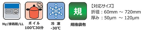 | シンプルな3層構成でありながら、あらゆる用途に柔軟な対応が可能 真空・ボイル・冷凍の3工程処理が可能な3層汎用タイプ。 中本アドバンストフィルムのロングセラー製品です。 ![]() ![]() ■用途 塩辛、厚焼き玉子、ホイップクリーム、味付け肉、明太子、カット野菜