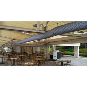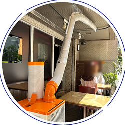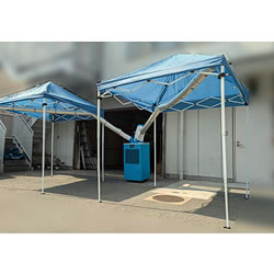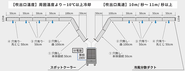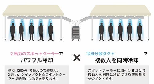 | 酷暑の現場に、涼しさの革命 低コストで実現できる最新の熱中症対策システム 単相(200V)2馬力スポットクーラー1台と冷風分散ダクトを組合せることで、8~10人を同時に冷却可能。 1人用スポットクーラーだと少人数しか冷やせませんが、このスポットクーラーであれば1台で10人まで対応できます。 ![]() ●1台の空調機で複数人の冷却が可能 ダクトに空いた複数の穴から冷気を噴射。 消費電力を変えることなく、複数人を冷却するので省エネにもつながります。 ●簡単設営 ファスナーでパーツを繋げるだけなので、誰でも簡単に設営することができます。 ●超軽量で取扱いが容易 超軽量素材で、使用しないときは小さく折りたためるので保管する場所をとりません。 搬送や収納も容易です。 ![]() ■ダクトに空いた複数の穴から冷気を噴射して、均等に冷やします。 ![]() ■レストランのテラスやイベント会場、製造現場や工場など様々な場所でご利用いただけます。 ![]() ■スポットクーラーに取付けるだけで最大3人まで冷却可能。 基本セットは、スポットクーラー1台に対し4種類のダクト5本です。 ![]() ![]() ■使用イメージ ![]() ■スポットクーラー外形図 ![]() ■システム構成例 ![]() ■スポットスーラー仕様