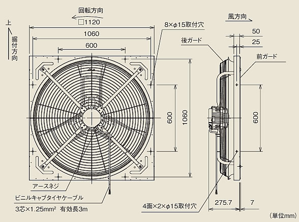■注意 ●納入仕様書をご確認の上、ご購入頂き、取扱説明書に沿って据付けを行ってください。 ●ガードの中へ手や物などを絶対に入れないでください。特に小さなお子さまにはご注意ください。 (ガードは人体の腕、体、頭部等の羽根への接触防止は可能ですが手先、指等をガードの隙間へ差し込んだ場合にはけがの恐れがあります) ●塩害地域においては、早期にさびが発生するため、定期的に保守点検・清掃を行い、必要に応じて交換を行ってください。 ●周囲温度は-10℃~+40℃まで使用可能。常温において相対湿度90%まで使用可能。 この範囲を超えますと焼損、変形、回転不良、破損につながる恐れがあります。 ●据付け及び修理は専門の業者にご依頼ください。 ●雨・水のかかる所でのご使用はできません。 ●送風機1台に電動機用過負荷保護装置1個を必ず取付けてください。 ●古くなった製品は買い替えてください。 ●消毒液等が付着した場合は水で洗い流してください。 ●高圧水洗浄時は洗浄ノズルを拡散にし、50cm以上離して洗浄してください。 ●1日50回以上のひんぱんな起動・停止を伴う使用は、羽根破損等の原因となりますので避け てください。 ●設置をする時、吸込側、吐出側に遮へい物がある場所には設置しないでください。 偏流が起り異音の発生や羽根破損等の原因となります。 ●市販のインバータとの組合わせによっては異常な振動、共振、騒音が発生することがあります。 ●必ずD種接地工事をしてください。 ●漏電ブレーカを必ず設置してください。 ●順送用途での設置[縦列配置]においては10m程度の間隔を空けて配置してください。 (間隔をあけないと製品が破損することがあります) ●取付けは取付金具または取付枠を作り据付けるか、つり下げるか、床面に置きます。 取付枠は強固なものとし、落下、転倒の危険がないよう特に材質、強度に十分注意してください。 ●電源ケーブルの結線部分に雨・水がかからないよう電気工事を行ってください。 |