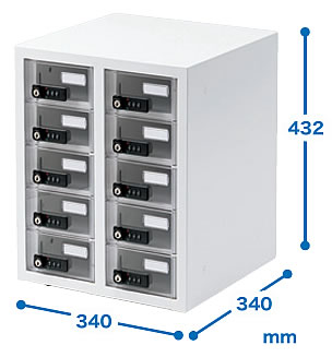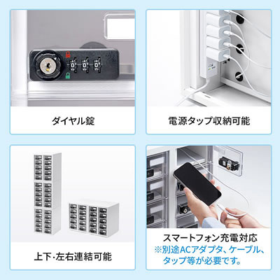 ダイヤル錠を各扉に採用。スマートフォンの個別管理に最適。内部が見える透明扉仕様。![]() ■特長 ●10台のスマートフォンを個別に管理できる保管庫です。 ●扉は内部の状況が確認できる透明仕様です。 ●鍵はダイヤル錠+検索キーを採用しており、使用者が鍵を紛失する心配がありません。 万が一番号が分からなくなっても管理者が番号検索キーで設定された解錠番号を検索することができるため、管理がしやすくなっています。 ●ダイヤル錠の開錠番号は使用者が都度任意の番号で設定することができます。 ●背面にタップ収納スペースがあります。 ●スマートフォン収納部の背面にケーブル口があり、背部のタップ収納部からの配線により収納したまま充電ができます。 ●アクリル板のネームプレート付きで、お名前や機器名を目視で管理できます。 ●上下左右に連結でき複数導入時にも一体化して使えます。(上下連結は3段まで) ●底面にはアジャスターを取り付けることができ、ガタつき防止に役立ちます。 ●セキュリティワイヤー装着のためのフックが標準装備されています。 ![]() ■透明扉で中身が見えて、保管状況がすぐわかる 中が見える透明扉なので、スマートフォンが収納されているかどうかが一目で確認できます。 ![]() ■10台のスマートフォンを個別に管理 学校・工場・オフィスなど、業務用・個人用問わずスマートフォンを保管する際に便利な保管庫です。 10台個別に収納でき、個人ベースでの管理が可能です。 ![]() ■鍵紛失の心配がないダイヤル錠 個別に暗証番号を設定できるダイヤル錠なので、使用者が鍵を持つ必要がなく、紛失の心配がありません。 万が一番号が分からなくなっても、管理者が番号検索キーを使用して暗証番号を確認できるので安心です。 ![]() ■スマートフォンを収納したまま充電ができる 本体の背面に電源タップの収納スペースが設けられているため、ケーブルやアダプタが外から見えません。 各収納部には充電ケーブルを通す専用のケーブル口があり、スマートフォンを収納したまま充電できます。 ※充電用のACアダプタ、ケーブル、タップは付属しておりません。 ![]() ![]() ■ネームプレート付き 使用者の名前や保管している機器名を記載できるネームプレート付きです。 ![]() ■上下・左右に連結できる 複数導入時にも、一体化して使用できます。 ![]() ■底面アジャスターを標準装備 設置場所の状況によるガタつきを防ぎます。 ![]() ■セキュリティワイヤー用フック装備 保管庫ごと盗難されるのを防ぎます。 ※セキュリティワイヤーは付属していません。別途ご購入ください。 ![]() ■前面・背面 ![]() ![]() ![]() ■寸法図 ![]() ■仕様