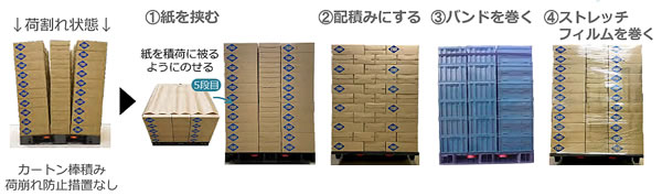| 輸出梱包推奨パレットです。 荷崩れ防止措置をしてご使用ください。 ※動荷重は荷崩れ防止措置を行った際の目安です。 ●荷崩れ防止措置を行う輸出梱包形態を考慮したエコノミー設計 ●オールプラスチック製なので輸出時の燻蒸・熱処理が不要 フック付き(8ヶ所)再生PP ![]() ■保管効率向上 パレットが薄く、省スペース ■荷崩れ防止措置用のフック 8箇所標準装備(リユースベルトにも対応) ![]() ![]() ■パレットトラック使用可 パレット全高を低くしながらも、差込口高さ88mmをキープ ■荷崩れ防止措置をしてご使用ください。 輸出梱包用パレットは、積載物が固定されていないとリフトアップ時に「荷割れ」が起こり、そのままでは搬送できません。 下記①~④のような荷崩れ防止措置をすることで搬送可能となり、荷崩れによる積載物の破損・損傷を防ぎます。 ![]() ■タイプ