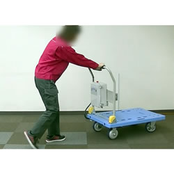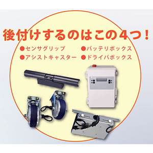 | お手持ちの搬送台車に 後付けカンタン ※台車の仕様によって取付できない場合もあります。 ![]() ![]() ![]() ■安全設計 荷重による加速でヒヤリとしがちな下り坂では、減速機能でスピードを制御し、荷物を積んだ状態でも、安定したスピードで下ることができます。 ●傾斜を検知してる間(アシストONの場合) ●台車の速度が6km/hを超えた場合(電源ON/OFF同様) は安全ブレーキが作動しますので、万が一、手が離れてしまっても、ゆっくりと安全に下ることができます。 ■キャスター 作業負担を軽減し、日々の運搬作業をアシスト! 女性や高年齢労働者など、全ての人が活躍できる働きやすい環境づくりへの取組みをサポートします。 産業用ロボットなどにも採用される高性能国産モータを備えたアシストキャスターは、ダイレクトドライブ駆動のインホイールモータのため、低振動・低騒音です。 ![]() ■曲がりにくい狭い角でも小回りが効くので切り返しや大回りの必要がなくスムーズな旋回が可能です。 ![]() ■特殊な台車への取付事例あり 規定サイズ内であればこんな搬送台車にも取付OK ■クイックセンシング 360°スピンターン ●コントロール性能 センサ内蔵グリップでコントロール性能の良さを実現 ●ラクラク運搬 いつもの運搬作業も電気のパワーでラクラク運搬 ●ストレスフリー 静かなモータ音で長時間の作業もストレスフリー ■さらにもしもの時に安心の3つの機能を搭載 ①非常停止スイッチ 異常が発生したり、危険を感じた際に緊急停止することが可能です。 ![]() ②ストッパー付キャスター ワンタッチで台車を固定。一時停止することが多い現場も安心です。 ![]() ③安全ブレーキ機能 走行速度が 6km/h を超えると安全ブレーキが作動する安全設計です (電源オフ時でも安全ブレーキは 作動します。) ![]() ■後付け・電動アシストユニット セット内容 ![]() ![]() ■仕様