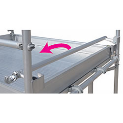 | 最大使用質量200kg スタンションを使って連棟できます。 パイプ径φ42.7 ![]() ■手すりわくの中桟が倒れるのでスムーズに作業床に乗り込めます。 ![]() ■巾木 ![]() ■連棟時イメージ ![]() ■アウトリガー ※段数が2.5段(2段+半中わく) 以上の時に必ず取付けてください。 ![]() ■φ150、ゴム製 ![]() ■タイプ