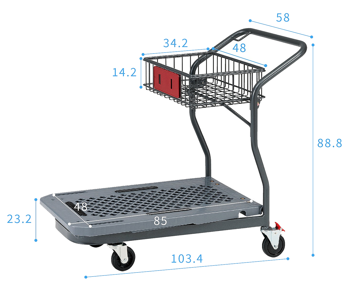 | ■特長 ●ホームセンターやスーパーマーケット、リカーショップで使用されている台車です。プロ仕様の堅牢な構造と使い勝手の良いスペックを兼ね備えています。 ![]() ●小物、バラものにも対応するバスケット付き。 大型商品だけでなく、小さい商品も載せることができます。バスケットは収納できるので、ネスティングも可能です。 ![]() ●ネスティング機能 スペースをとらずコンパクトに収納・保管ができます。 ●メッシュ天板 天板に穴をあけたメッシュ構造により、水や汚れがたまりにくいため、 管理を容易にし、快適にご使用いただくことができます。 ![]() ●後輪ストッパー付 荷物を積み降ろしする時、台車が動かないように固定できるので、安全に作業ができます。 ![]() ■寸法図 ![]() ■仕様