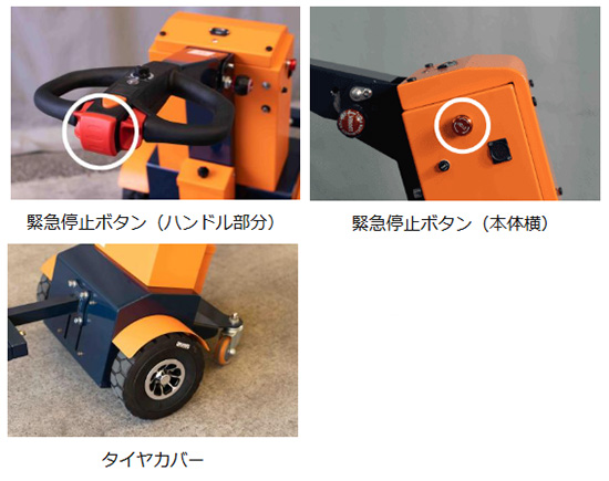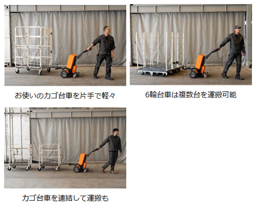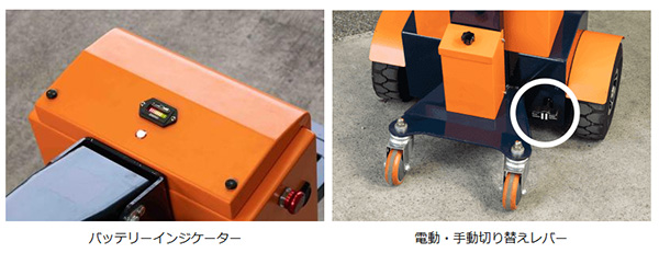 | 楽しく、らくらく、快適に! ・作業が圧倒的に楽になる ・女性やシニアの方も簡単に使える ・作業が楽しくなる 「体力的にキツイ…」「重量物の運搬が危ない…」など現場の様々な悩みの声に応えるべく電動アシスト牽引車が登場。 お使いの台車に取り付ければ牽引らくらく!過酷な物流現場に救世主現る! ![]() ■特徴 ●単操作!速度調整ラクラク! M2559ETV2-1000KGはスイッチを押して電源オン。 前進・後退はスロットルを回すだけなので、初めての方でも操作は簡単です。 速度はつまみで無段階調整できます。 ![]() ●1t(1,000kg)もラクラク牽引! 電動アシスト牽引車「パワフルバディ」は水平使用時に1t(1,000kg)までの重量物を牽引可能です。 大変だった重量物の運搬も軽々運べます。 ※使用環境により最大牽引重量が異なります。 ![]() ●家庭用コンセントでラクラク充電! M2559ETV2-1000KGは家庭用電源プラグ(8~10時間の充電)で最大6時間稼働します。 家庭用コンセントで充電できるので、手軽にご利用いただけます。 ![]() ●バッテリー残量 簡単確認! M2559ETV2-1000KGのハンドル近くにあるバッテリーインジケーターで残量を確認できます。 充電が切れてしまった際は、足元のレバーを下げると手動で移動可能です。 ![]() ●安全対策も充実!もしもの時も安心! M2559ETV2-1000KGのハンドル部分と本体横に緊急停止ボタンがあります。 さらにタイヤカバーがあるので事故防止に繋がります。 ![]() ●アタッチメント本体取付部は2種類! M2559ETV2-1000KGのアタッチメント本体取付部は固定式と可動式の2種類が付いてくるので、ご利用用途に合わせてご使用いただけます。 ![]() ■用途 台車に積載した重量物の運搬など ■仕様