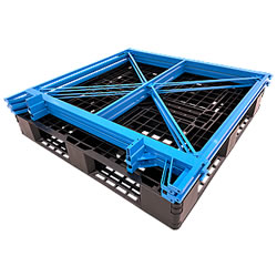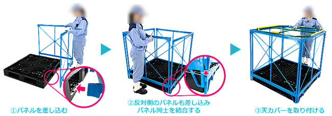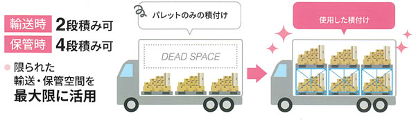 | 輸送にも保管にもパレット段積みようアタッチメント パレット荷物積載状態でも簡単に組立可能 パレット内寸をそのまま使える。 段積み出来ずに空間がムダに、そんな物流現場のお悩みを一挙解決。 輸送効率アップ、コンパクト収納、簡単組立を実現します。 ![]() ■特徴 かんたんな組立作業 分割パネル構造になっており、パネルの下部をパレットのフォークポケットに差し込むことで、簡単に取り付けることができます。 また、パネル同士はボルトや工具を使用せずに結合できるため、誰でも手軽に組立作業を行えます。 さらに、パレットに荷物を載せたままでも組み立てが可能なうえ、パレットの内寸を最大限に活用できる構造のため、積載量が減る心配がありません。 ■輸送・保管効率の向上 段積みできない荷物も、省スペースかつ安全に輸送 従来、段積みができない製品はトラック積載時に上部の空間が無駄になり、輸送効率が低下していました。 段積み可能な構造により空間を有効活用できるため、輸送効率の向上に貢献します。 さらに、輸送中の荷崩れを防止し、輸送品質の向上にも寄与します。 ![]() ■コンパクト収納で保管スペース削減 ●使用しない時はパネルを折りたたみ、パレットに収納可能 ●スリムな形状で非使用時も省スペース ![]() ■誰でも簡単。組立&脱着作業 ●分割パネル構造&工具不要 ●パレットのフォークポケットに差し込み、ピンで連結、天カバーを取り付けるだけ ●パレット内寸を最大限に活かせる設計でいつもの荷姿に簡単フィット ![]() ■多段積み可能 高い剛性を持つ構造により、製品を積載した状態でも安定して多段積みが可能です。 段積みすることで、スペースを有効活用できるため、限られた保管・輸送空間でも効率的に荷物を配置でき、積載効率の向上に貢献します。 ![]() ■標準仕様適合パレット 一般的な11型のパレット形状に適合するように設計しておりますが、パレットの形状によってはご利用頂けない場合があります。 ご利用可能なパレット形状の各寸法については以下のとおりです。