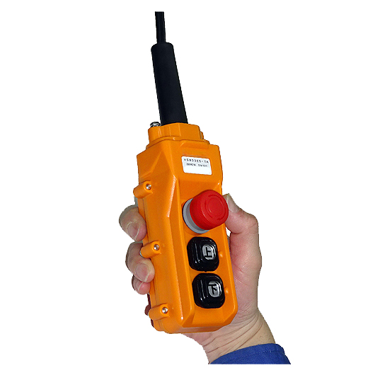 非常停止付きペンダントスイッチ:非常停止ボタン付きです。また、上・下ボタンは2段押しで高速、低速が切り替わります。