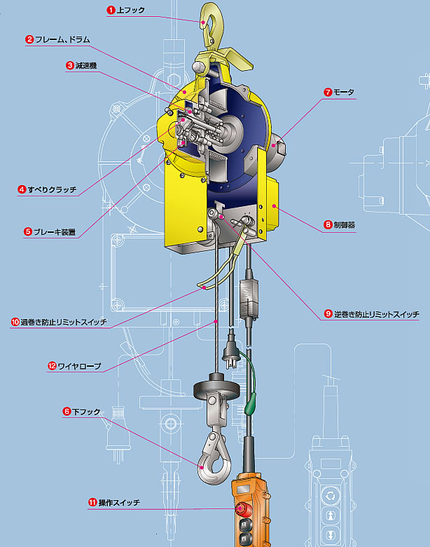 巻上げの際に、過巻によるワイヤロープ切断、機械破損を防ぎます。