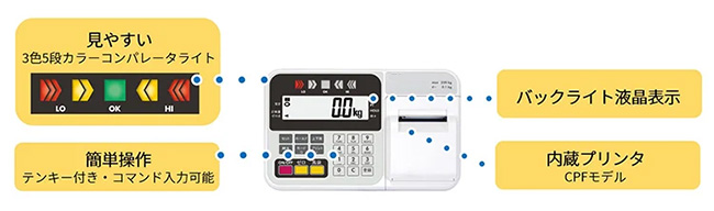 | M2SL200KCF-JAA:標準タイプ M2SL200KCPF-JAA:プリンタ内蔵タイプ(感熱式) ・スロープ 1枚付属 ・低床型の台はかり(積み下しを考慮した高さ40mmの荷重載せ部) 全体 919(W)×808(D)mm / 荷重載せ部 690(W)×800(D)mm ・防塵・防水等級 IP55(計量台) ・豊富なインタフェースオプション Bluetooth(R) / USB / RS-232C / ブザー・リレー ![]() ※ストッパー:黄色の部品は別売です ■特長 カートなどの計量に便利な低床型、スロープ1枚付属 ●計量台は防塵・防水等級IP55 ●台車やワゴンでの計量に最適な低床型のデジタル台はかり ●計量台は移動に便利な取っ手とキャスター付き ●計量台を斜めにすると床面にキャスターが、垂直にするとゴム足ストッパーが接地する構造 安全確保の為に、付属のスロープの反対側に別売の増設用スロープまたはストッパーのいずれかを設置することを推奨します。 ![]() 3色5段コンパレータライト ●見やすい3色のライトで作業効率アップ パック詰め作業(少ない・ちょうどよい・多い / 3段または5段) ランク分け作業(Sサイズ、Mサイズ、Lサイズ ・・・ 最大7段まで) ●抜き取り計量(マイナス計量)にも使用可能 ![]() 便利な機能 ●棚卸し、在庫数量管理に 個数計機能 ●連続した計量に 累計機能:計量した回数とその合計質量を記録可能(最大累計回数999回) オートテア機能(自動風袋引):容器を載せると自動的に風袋引きしてゼロを表示(コンパレータ機能との組合せによる) ●容器の重さをゼロにする風袋引き機能は、テンキーであらかじめ風袋値を入力することも可能 別売品USBインタフェース ●台はかりをPCに接続し、計量結果を送信することができます。双方向通信の為、はかりのプリントキーによる送信の他、PC側からコマンドを送る事もできます。 ※ご注意ください 市販のUSBケーブルABタイプが別途必要です。また、はかり本体とPCをUSBインタフェースで通信させるには、専用ドライバーが必要です。また、表示部部分は非防水になります。 別売 Bluetooth(R) 通信インタフェース(M2SLP-27CJAA) ●スマートフォンやPC、Bluetooth(R)通信外部表示器などに無線でデータ送信が可能。 ■仕様 ●タイプ別