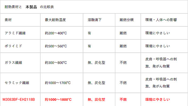 | ・瞬間的に1800℃の高温に耐え、1000℃以上の環境でも3分以上の耐久性を持ちます。 ・優れた耐薬品性と耐腐食性を持ち、強酸や強アルカリなどの化学薬品に対しても性能を維持します。 ・強力な抗菌性と抗ウイルス性を備えており、繊維上での細菌やウイルスの増殖を抑制します。 ・長期間、繰り返し使用が可能で、紫外線に晒されても劣化しにくい素材です。 溶接、金属加工、被熱作業に最適です。 ![]() ■特長 ●瞬間最大耐熱1800℃です。 ●長期間、繰り返し使用が可能です。 ●紫外線に晒されても劣化しにくい素材です。 優れた柔軟性を備えながら、瞬間的には1800℃の高温に耐え、1000℃以上の環境でも3分以上の耐久性を誇る素材で不燃性紡績糸と生地です。 耐薬品性、耐腐食性もあり、炎にさらされても収縮しません。 様々な天然・合成の紡績糸と組み合わせて交織することで卓越した不燃効果に+αの機能性を加えることができます。 消防装備、工業紡績、建築安全、航空宇宙など、様々な分野で理想的な素材として使用することができます。 ![]() ■用途 ●溶接、金属加工、被熱作業に最適です。 ■耐熱素材との比較①LOI値 ![]() ■耐熱素材との比較②素材ごとの要素 ![]() ■本製品が出来るまで 原材料はアクリロニトリル(アクリル)。 アクリルはワイヤードローイング、重合、耐炎化処理等の一連の処理を経て酸化アクリル繊維ができます。 その後に酸化アクリル繊維を様々な工程を通して物性を変えて、紡績して得られます。 ■行程 アクリロニトリル→ アクリル繊維→ 酸化アクリル連続繊維→ ステープルファイバー→ 紡績糸→ 生地 ![]() ■仕様