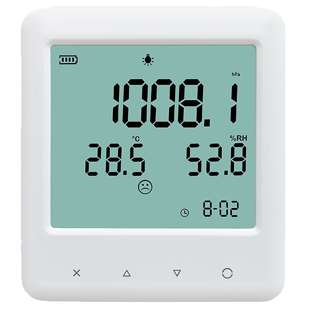 | ■特長 ●大画面のLCDディスプレイで、リアルタイムの気圧、温度、湿度の値、最大・最小・平均、設定したアラームの上限・下限、電池残量が確認できます。(※ロガーの機能はありません。) ●設定したアラームの値を超えた場合にブザーで警告します。 ●快適度を顔アイコンで表示します。 ●露点温度、湿球温度の表示ができます。 ●卓上・壁掛けどちらでも使用できます。 ![]() ■用途 気象、環境モニタリング、気象条件シミュレーション、航空、高地輸送のモニタリング、高層ビルや特殊施設の環境管理、博物館やアーカイブ施設、気圧と温湿度管理が重要な医療施設、加圧室の気圧管理、天候予測など気圧、温度、湿度の監視が必要な分野で活用ができます。