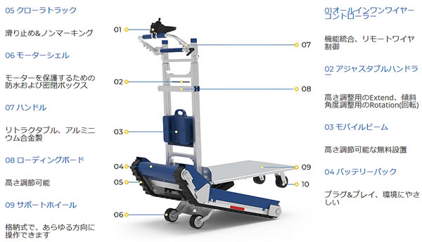| 階段で最大420KGの貨物を積み込む無線リモコン階段クライマーであり、独立した非マーキングと滑り止めクローラートラックを装備したM3104EF-420WLTのプレミアムバージョンであり、狭い階段コーナーで操縦でき、屋内と屋外の両方で平らな面や階段で簡単に移動できます。 オールインワンのワイヤーリモコンで操作し、1本の指で1本の作業モードから別の作業モードに切り替え、インテリジェントなローディングボードは階段の負荷傾斜角度を自動的に調整できます。 ![]() ![]() ■各部名称 ![]() ■使用イメージ ![]() ![]()
