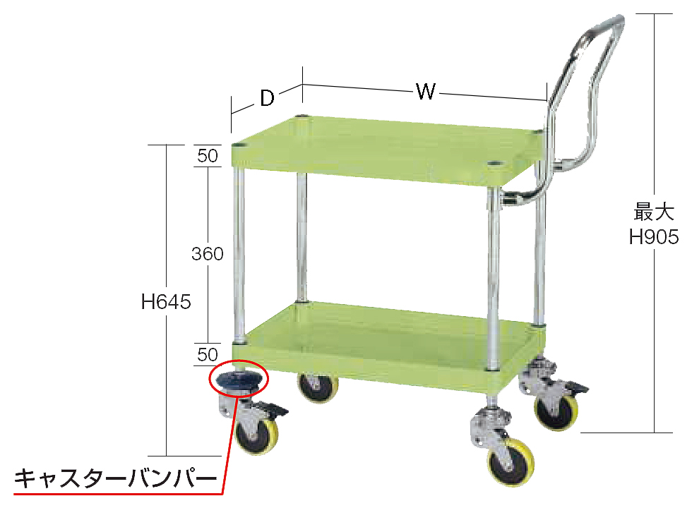 | ■特長 ●衝撃を和らげるキャスターバンパー付ワゴン ●キャスターは振動吸収・帯電防止ウレタン車 ●高さ645mmタイプ ●棚板2段 ●4輪自在 ●支柱25.4mm ●均等耐荷重50kg ●棚板厚は、M350SP-6062で0.8mm、M350SP-7562で1.0mm ●取手:50mmピッチで段替え可能 ■棚板断面 ![]() ■寸法 ![]() ■タイプ