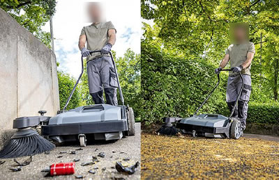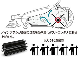 | 清掃時間を1/5に短縮 超軽量 業務用スイーパー 選ばれたクリーニング性能 電源やバッテリー不要。押して歩くだけで中のブラシがゴミをコンテナに掃きこみます。 ![]() ■特長 手押しスイーパーは、屋内外のあらゆる場所を簡単かつ便利に清掃できます。 100平方メートル以上の広さを清掃する場合、ほうきよりもはるかに効率的です。 軽量で、車輪の回転抵抗が低いため、操作や持ち運びが簡単です。 メインのブラシが、左側の車輪の回転により駆動され、ゴミをコンテナに送り込みます。 サイドブラシは、端や隅を掃くように設計されています。 広い場所を清掃する際は、サイドブラシの回転による粉塵の発生を抑えるために、サイドブラシを折りたたんで清掃することができます。 サイドブラシは、粉塵を飛ばしすぎないよう、また、摩耗を大きくしないように、面圧を調整可能です。 サイドブラシの交換に工具は必要ありません。 コンテナは容易に取り外しができ、簡単に中を空にすることができます。 容器の前面は平らであり、必要に応じて直立させて置くことができるような形状になっています。 折りたたみ式のプッシュハンドルは、作業者の身長に合わせて調整でき、また、完全に折りたたむことも可能で、折りたたんだ後、立てられるため、省スペースで保管できます。 ■高い作業性で効率よく掃き掃除 手で押して移動するだけで、幅700mmブラシがタイヤと連動して回転し、チリや埃をはいて清掃します。ブラシは、間隔を適度に空けることで、回収したゴミがブラシ内に溜まることなくスムーズにコンテナに入り、清掃効率が高まります。 また、この構造は、長い毛などが挟まっても簡単に抜き取れ、メンテナンス性も高めます。 最大で、5人でホウキを用いて清掃する場合と同じ時間で清掃が可能になり、清掃時間を大幅に短縮できます。 ![]() ■清掃時間を1/5に短縮 超軽量、業務用スイーパー ![]() ■粗いゴミも細かいゴミも ![]() ■プラスチック製ボディで超軽量 重さ12.7kgを実現。一人で運搬ができ、片手でも軽く持ち上がります。 軽い力で押せるので、作業性もよいです。 ![]() ■扱いやすい操作性 シンプルで快適な操作で疲労を軽減 ハンドルの高さは身長に合わせ3段階に調節でき、楽な姿勢で作業が行えます。 コンテナとボディは、強化プラスチック製で、凹みの心配は少なく、かつ、何かにぶつかった時の衝撃も少ないです。 ![]() ■優れた収納性 ハンドルをたたむことで、立てかけて省スペースで収納することができます。 ![]() ■用途・清掃場所 ●公園や駐車場 ●通路 ●ホテル ●製造工場 ●また、農業関連施設、農場、納屋にも最適です ■仕様