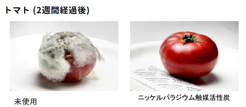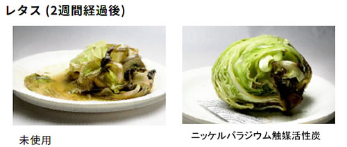 | 本製品は、ニッケルパラジウム触媒活性炭を添着した活性炭で、野菜・果物・生花の鮮度保持を目的としています。 エチレ ンガスを吸着・分解し、成熟を抑制することで鮮度を長期間維持します。 分解された成分(二酸化炭 素と水分)は、植物にとって有益であり、環境にも配慮した設計です。 冷蔵庫などでも長期的に安定 した効果を発揮します。 ![]() ■特長 エチレンガス分解 活性炭がエチレンガスを引き寄せ、ニッケルパラジウム触媒活性炭がエチ レンガスを分解します。 これにより、青果物の成熟を抑制し新鮮さを保持します。 環境改善効果 エチレンガスは触媒により二酸化炭素と水分に分解され、これが青果物の栄養源となって還元されます。 これにより、環境が改善され、青果物の保存状態が最適 化されます。 長期間持続ニッケルパラジウム触媒活性炭は長期間にわたって効果を発揮し鮮度保持の効果が持続します。 冷蔵庫内などでの使⽤に最適です。 ■用途 青果物用鮮度保持 業務用冷蔵庫、冷蔵ショーケース、冷蔵トラックなど ■比較実験 メーカーのニッケルパラジウム触媒活性炭(商標:エチトール®)は、吸着作用に優れた高品質のヤシ殻活性炭に遷移金属のパラジウムとニッケルをナノ粒子状態で添着した活性炭です。 病院等で使用される酸化エチレンガスや青果物から放出されるエチレンガスの分解機能があります。 ![]() ![]() ■用途 エチレン感受性の高い野菜・果物・生花の鮮度保持用。 業務用冷蔵庫やショーケース、輸送用冷蔵トラック内での使用に適しています。 ■仕様