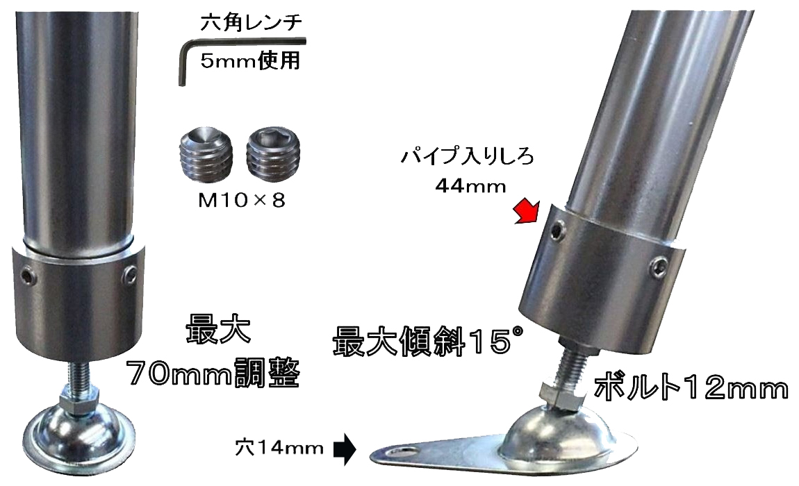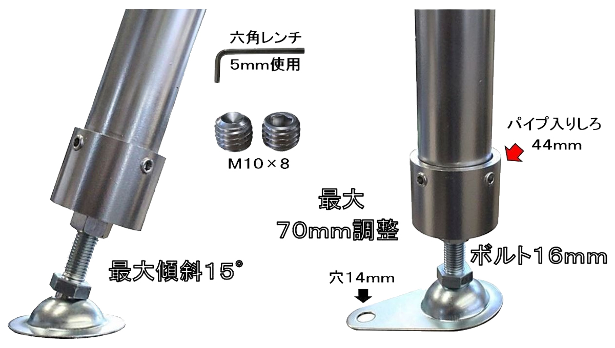 | ■特長 ●外径48.6mmの単管パイプ用に設計されたアジャスタータイプのジョイント金具です。 ●その高い耐荷重性能と調整機能により、DIYから軽作業用途まで幅広く活用されています。 ●鋼製ホーローセット(M10×8mm)を使用し、確実な締付けが可能 ●アジャスターボルト径12mm(M4250SPJ-JA16シリーズは16mm)で、最大70mmの高さ調整が可能 ![]() ![]() ■タイプ