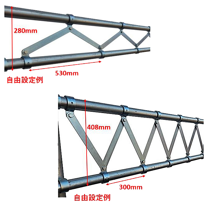 | ■特長 ●単管パイプのトラス梁 高さ・幅・長さ・ピッチを自由な設定でトラス梁が組み立て可能 ![]() ●40kg(20kg分銅×2個)の荷重をかけてもたるまない ●フランジボルトとフランジナットはM4250SPJ-JTFSに付随しております。 ![]() ![]() ■サイズ(M4250SPJ-JTFS) ![]() ■タイプ