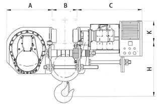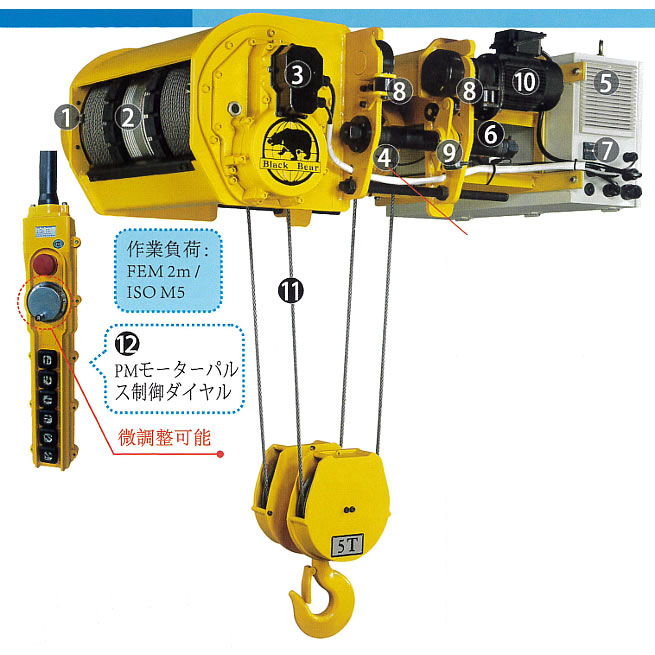 (1)誘導モーターの場合、5~50Hz (60Hz) のレンジ内だと速度調節できますが5Hz以下だとできません。 (2)サーボモーターにインバータを組み合わせると、0.1Hzから定格周波数 までのレンジ内で速度調節できるとともに、0.1~5Hzのレンジ内でもパルス制御機能を用いて超スロー運転による巻上巻下が可能です。 ■世界初約1mm単位で操作できるワイヤホイスト 操作してみてください ●具体的メリット 1.組立作業 周波数0.1~5Hzのレンジ内で、ダイヤル制御のパルス駆動装置により巻上巻下時のモーション速度を調節。 細かな1~2mm単位で着地場所を定めて組立作 業を行えます。 2.CNCマシニングにおける金型移動作業 重いものをマシニングセンターに置きたいとき、パルスのダイヤル調節によって吊り荷移動の速度を調節し、加工台に置くときに超スロー運転して衝撃をやわらげ、機械の損壊や精度の狂いを防止できます。 ![]() ①ホイストモーター&DCブレーキ 1)PMモーターは、定格の1.5倍の始動電流、230%の高始動トルクであり、定格の6~8倍の始動電流を要する従来の誘 導モーターに較べて30~50%の節電。 2)PMモーターの負荷運転時、熱的平衡の温度55°~60° 3)PMモーターは回転数ゼロ(いわゆるゼロ速度100%トルク)になってからブレーキがかかるので、従来のモーター に較べてライニングが摩耗しにくく、長寿命。 4)最新型の直流(DC)電磁ブレーキと 同期モーターの動作による抜群の制動力 5)制動力設計150%、最大200% ![]() ②ロープガイド(ブロック型) 1)ワイヤーロープを安定してドラム溝内に巻き取るので、下フックの地面接触によるワイヤーロープの溝脱落、吊り上げ後の損壊が起きません。 2)特許登録:台湾特許済み、ドイツ特許済み、日本特許済み、中国特許済み、アメリカ特許済み ![]() ③遊星ギア式リミットスイッチ 1)巻上巻下、いずれもリミットスイッ チによる自動停止機能により過巻き を防止して安全確保。 2)作業現場のニーズにより、トリガー 停止の位置決め可能。 3)特許登録:台湾特許済み、ドイツ特許済み、日本特許済み、中国特許済み、アメリカ特許済み ![]() ④荷重検知器 負荷運転時、検知器が吊り荷の重量を検知し、オーバーロードを判断。 ![]() ⑤コントローラ ⑥ブレーキ抵抗器 1)VVVFインバータ制御により、従来型と較べて30%の節電。 2)調速機能は、速度比が最大で1/10 、低速、高速の範囲を任意に設定でき、押ボタンによる2段式切換が可能。 ⑦カウンター メンテナンス実施の拠りどころとするため、モーターと電気的パーツの起動、操作回数を記録します ⑧ガイドホイール ビーム両端のガイドホイールが、トロリー横行時のスムーズで安定した走行を確保。 ⑨バランサー ドラム側との重量バランスをとるとともに、空荷運転時に左右のバランスを保ちます。 ⑩モーター メンテナンス実施の拠りどころとするため、モーターと電気的パーツの起動、操作回数を記録します ⑪高強度ワイヤー S.IWRC 8 xP. WS(26) -sを使用。6倍以上の強度、安全率により巻上巻下の安全確保。 ⑫PMモーターパルス制御ダイヤル ■多用途 · 多機能 1.VVVFインバータ制御により、従来型と較べて30%の節電。 2.お客様のニーズによる速度設定(多段モーション操作、通常の二段速制御)。 3.停止直前に速度を十分に落とす減速機能により、吊り荷の揺れを防止。 4.標準速度を定格速度の1.5倍とする軽負荷高速機能 (オプション)。 5.過負荷防止機能。 6.調速機能: 速度比が最大で1/10、低速、高速の範囲を任意に設定でき、押ボタンによる2段式切換が可能。 7.使用寿命延長:モーター回転数ゼロになってからブレーキがかかるので、ギアの衝撃を緩和できます。通常 の電磁接触器による制御よりも使用寿命の長い無接点式制御を採用。 8.保護機能: 過電流保護、過電圧保護、不足電圧保護、出力欠相保護、インバータ過熱保護、ブレーキ抵抗過熱保護、モ ーター失速保護。 9.モニタリング機能:出力周波数、モーターの速度、電流、トルク、出力。 ■VVVF制御による昇降機能 ![]() ■寸法図 ![]() ![]()
