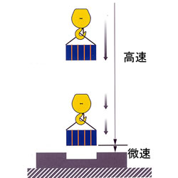 | サーボモーターによる 精密な調速 ·着地 サーボ制御系統が周波数0.1~5Hzのレンジ内でパルスによる精密な調速、着地を行えるので、巻上巻下時において、着地場所に合わせての任意の減速が可能です。 ![]() 1.原理 サーボモーターの特性により、ゼロ速度100%トルクのもとで、手動ダイヤルによるパルス駆動制御を通して、精度の高い着地が求められる組立作業で、巻上巻下時における微速運転が可能です。 2.サ-ボモーターと誘導モーターのちがい