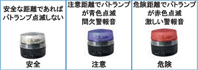 | はさまれガード トンネル点検車・高所作業車・垂直昇降機等と上部構造物との接触や挟まれ事故を防止するレーザー式接触警報装置 ●取付取り外し簡単 高所作業車のバケット等に取り付けたレーザーセンサが天井までの距離を計測し無線でパトランプにデータを送ります。 ![]() ■特長 ●細いレーザービームを使用しており超音波方式より検出距離が長く誤動作も少ない。 ●設定された距離以下になるとパトランプが音と光で警告します。 ●パトランプとセンサはマグネット取付式でキャビン・バスケット内等、昇降スイッチのある場所に簡単に設置可能です。 ■レーザーの検知距離 ![]() ■音と光でお知らせします。 注意距離/危険距離の設定が可能 センサーからの情報で点滅 ![]() ![]() ■仕様
