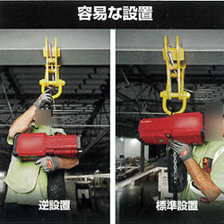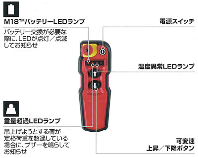 | ●逆設置で使用可能 ●コード、本体持ち上げ不要の設置 ●ワイヤレスリモコン:最大使用範囲18.3m ![]() ■機能 ●逆設置で使用可能 ●コード、本体持ち上げ不要の設置 ●ワイヤレスリモコン:最大使用範囲18.3m ●定格荷重1トン(1000キロ)、標準揚程 6m ●手動式より、負荷を低減 ●微調整可能の無段階可変速 ●本体のみの質量は20.9kg ●コード式電動チェンブロックの1/3の重さ ●チェーン収納しやすい付属チェーンバッグ ![]() ![]() ![]() ■多様な設置方法 ![]() ■M18 12.0Ahバッテリー装着時に、1トンの荷重を18.3メートル上昇・下降した場合 ![]() ■重量約20kgで一人で容易に設置が可能。 天井の低い場所や、狭い場所でも抜群の操作性を発揮 ![]() ![]() ![]() ■仕様
