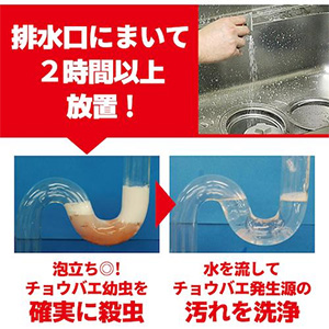 | 1回使い切りの粉末タイプ(10包入) 成分が隅々まで行きわたる発泡成分配合 ![]() ![]() ■特長 ●殺虫成分と漂白成分のW効果です。 ●水回りで発生するチョウバエ幼虫を確実に殺虫します。 ●チョウバエの発生源対策として、汚れを洗浄し除菌防臭効果できれいな状態を維持します。 ●発泡成分を配合しているので成分が隅々まで行き渡ります。 ![]() ■用途 チョウバエ幼虫、ショウジョウバエ幼虫の駆除、ヌメリ、油汚れ、湯垢の洗浄、除菌、防臭。 ■仕様