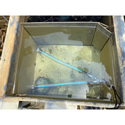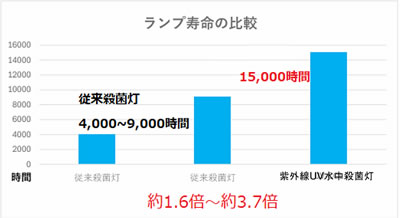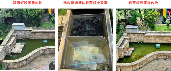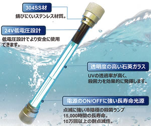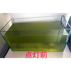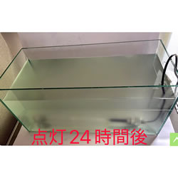 ■水量約14リットルのグリーンウォーターに水中殺菌灯を沈め、24時間点灯させました。 実験前は、濁りでランプが見え辛い状態でしたが、翌日にはランプが確認できるまで水質が改善されました。 ![]() ■冷陰極水中殺菌灯の用途・ラインアップ
