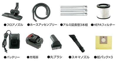 | 人手不足の現場を支え作業効率を変える 業務用コードレス掃除機 清掃する人の負担を軽減し快適な操作性を追求 ![]() ■特長 ●コードレスで作業効率アップ 面倒なコードの抜き差しや巻き取り作業が不要。 広い施設でも コンセント位置を気にせず清掃でき作業効率が向上します。 ●軽量、コンパクトボディで取り回しがラク 本体は 約2.5kg(バッテリー除く)女性スタッフでも扱いやすく階段や客室などの持ち運び清掃もスムーズです。 ●ストレスフリーな軽い操作性 フロアノズル、延長管を軽量化することで、手元に伝わる重さを軽減 本体の追随性もよく、軽い力でラクに清掃が行なえます。 ●コード式に迫るパワフルな吸引力 強力吸引でコードレスでもコード式に迫る吸引力を実現します。 ![]() ●最大43分の連続作業が可能 18V 4hリチウムイオンバッテリー搭載 エコモード:約43分 パワーモード:約25分 ![]() ●HEPフィルター装備排気がクリーンで衛生的 HEPAフィルターを標準装備。微細な埃や花粉PM2.5などを約85%以上除去します。 ![]() ■付属品 ![]() ■仕様