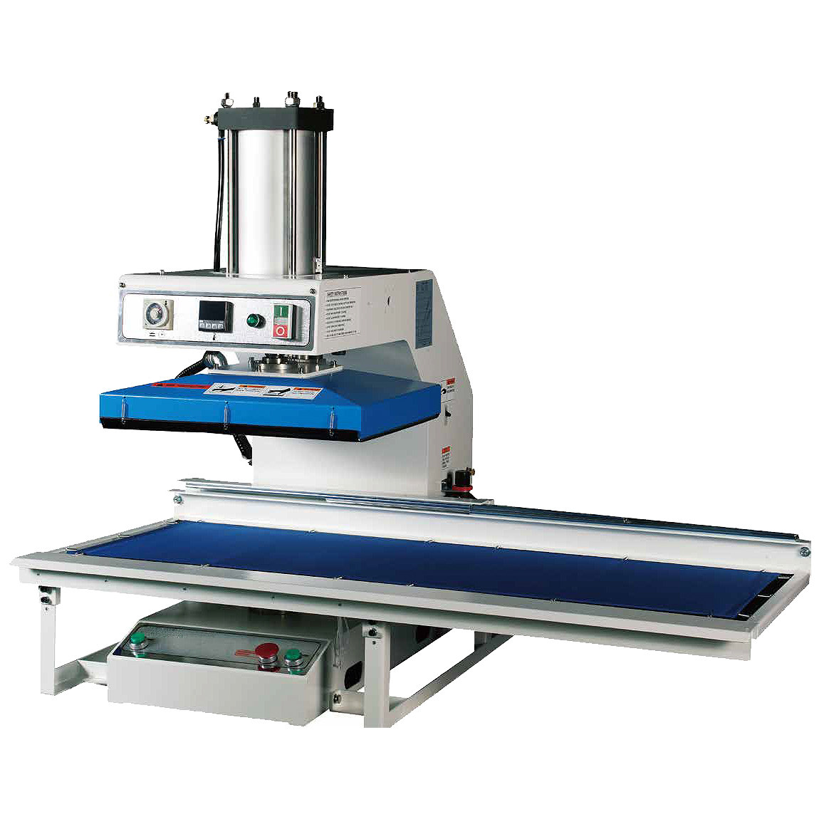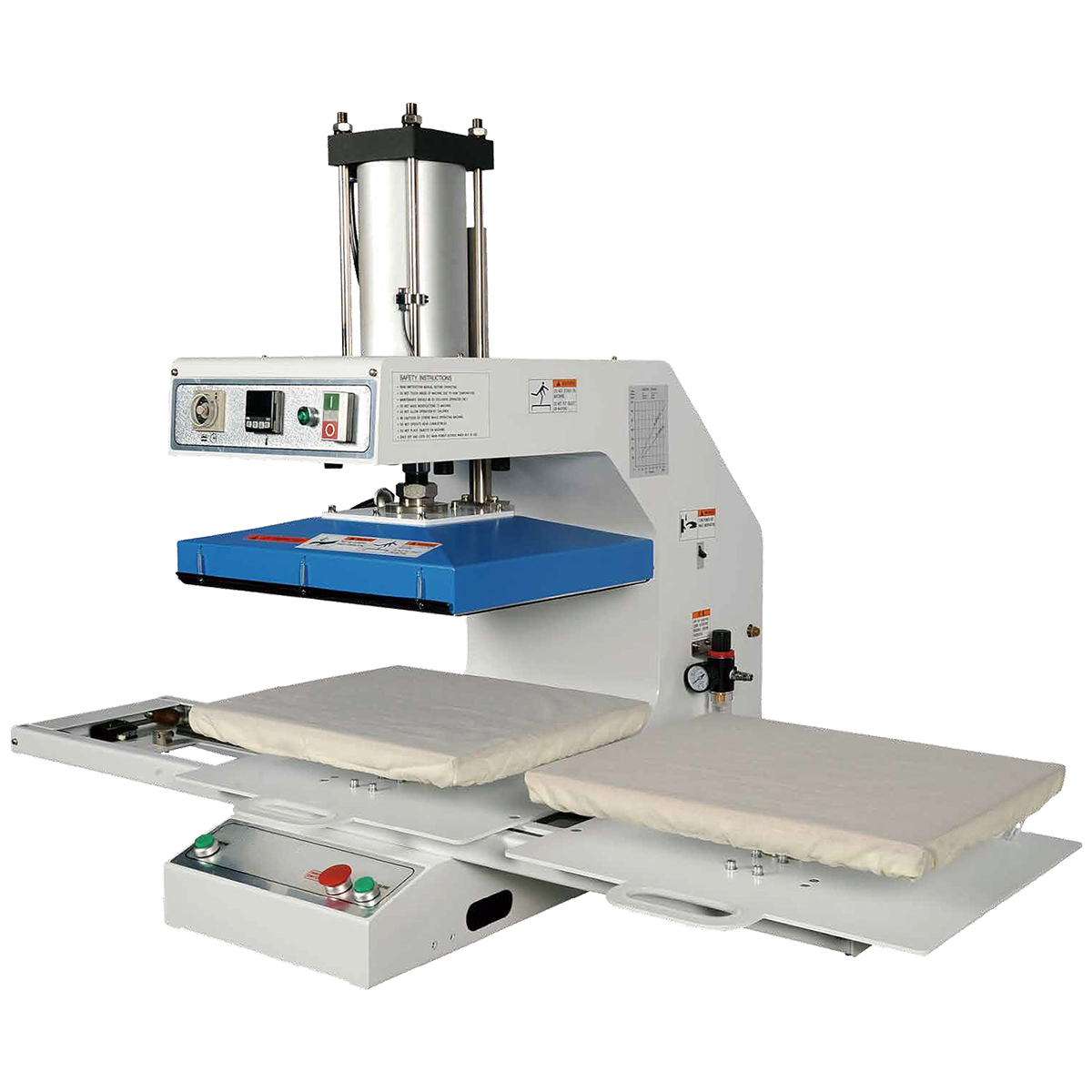 | ■特長 ●製品の大きさに合わせて下ゴテが変えられる全自動転写用プレス。下ゴテ(オプション)が製品に合わせワンタッチで交換できます。 ●エアー駆動による全自動タイプです。(※別途2HP以上コンプレッサーが必要です。) ●水平加圧方式により、均一に加圧でき、製品のズレを防ぎます。 ●圧力、温度調整、時間はダイヤルで簡単に行えます。 ●上ゴテはアルミ板及びテフロンシートを使用していますので、汚れにくく、清掃も簡単です。 ●下ゴテにシリコンマットを使用しています。 ●安定した圧力バランスで作業が行え、転写ムラを防止します。 ●M606HTP-P4536AWHはダブルトレー仕様でTシャツプリント向けです ■タイプ