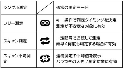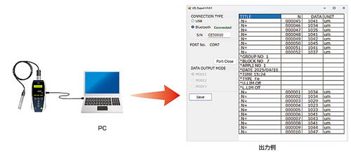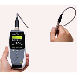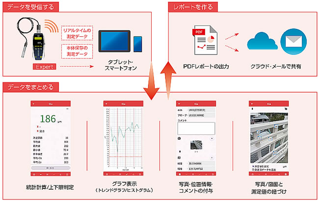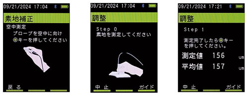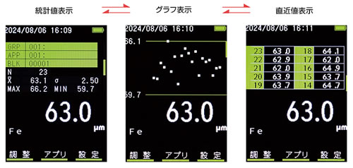 | ●プローブ型膜厚計の標準モデル(M70L-600SK) ●データ保存性・出力性を強化したBluetooth搭載の上位モデル(M70L-600EK) ●電磁式・渦電流式各プローブ別売(必須オプション) ●ブロック/グループ統計計算機能 ![]() ハンディタイプの膜厚計です。 測定対象・用途に応じてプローブを付け替えることが可能です。 高い視認性と持ちやすい形状を備え、屋内外を問わず様々な場面での膜厚測定に対応しています。 ガイド機能を備えたわかりやすいユーザーインターフェースと、豊富なカスタマイズ機能・高度統計機能により、膜厚計を使ったことのない方から熟練者まで、幅広い方に快適な膜厚測定をご提供いたします。 ![]() ■モデル構成 汎用的なStandardモデルにくわえ、大容量データメモリとBluetooth機能を搭載し、より現代的なデータ処理ニーズに対応したExpertモデルをご用意しました。 本体+プローブ ![]() ![]() ■より見やすく、より持ちやすく ●2.7インチフルカラーLCD(Blanview液晶*1) 採用 メーカー従来器種と比較して、視認性が大幅に向上しています。 また、直射日光下での使用時も視認性が高くなっています。 カラー液晶ながら低消費電力であるため、長時間の連続使用も可能です(最大70時間*2)。 「屋外でも屋内でも」さまざまな場所で長時間使用することができます。 1:Blanviewは株式会社オルタステクノロジーの登録商標です。 2:単3アルカリ乾電池、バックライト明るさ最小、測定モード:シングル、1回/秒測定時 ●持ちやすさを意識したコンフォータブル・デザイン 従来器種よりもスリムに、手にフィットするくびれのある形状をデザインしました。 ●直感的なキー構成 キーは、画面と連動する3つのファンクションキーと、電源・削除・上下・決定キーのみ。 これらシンプルかつベーシックなキー配列は、どんな方でも迷うことなく直感的な操作ができます。 ![]() ■よりわかりやすく、よりやさしく ●親切でわかりやすいユーザーインターフェース 画面は案内ガイドつきのUIです。 とくに調整作業は、イラストと案内ガイドの画面によって迷わず操作を進められます。 また画面上のQRコードから、すぐに操作説明動画にアクセスすることもできます。 ![]() ●言語切り替え機能 日本語/英語/中国語/韓国語の4言語に対応。いつでも切り替え可能です。 ●プローブチェック機能 ユーザーでは判別がつきにくい、プローブのケーブル断線が発生しているかを簡易的にチェックすることができます。 ■進化した統計・出力機能 ●統計情報切替 測定画面は、3種類の統計情報を表示できます。 いつでも上下キーで切り替えて確認できます。 ![]() ●高度統計機能(グループ/ブロック機能) 測定結果は、指定したグループ内のブロックに分けて保存できます。 測定対象・製造ロット・測定場所ごとにグループやブロックを分けておくことで、任意のデータ群の統計値を簡単に得ることができます。 グループは50グループ、ブロックは合計1000ブロックまで登録できます。 ●データ出力機能(日付指定出力) 測定結果は、USBまたはBluetooth(Expertモデルのみ)で外部機器へ出力できます。 グループ/ブロックごとの出力はもちろん、当日/前日といった日付指定出力も可能ですので、その日に取った測定データだけを、ワンアクションで出力させられます。 ■進化した測定機能 ●測定4モード 従来の測定モードに加え、新たに自動的に測定値を取得し続けるスキャン測定/スキャン平均測定モードを追加しました。 これにより、これまで以上に測定効率が高まりました。 ![]() ●ファンクションキー変更 測定画面のファンクションキーは、自由にカスタマイズすることが できます。 よく使用するキーを登録しておくことで、より一層、測定作業が迅速化されます。 ![]() ■進化したプローブ ●形状適応プローブ「M70L-600**」 新開発の電磁式センサを搭載した新型プローブ「M70L-600**」が登場しました。 M70L-600**はセンサ感度が向上しており、測定対象の形状による影響が軽減されます。 エッジ部の測定、素地が薄いものの測定、曲面が多く複雑な形状のものの測定などに適しています。 ![]() ●アプリケーション・メモリ機能 プローブにアプリケーション情報(調整データ等)を、50種類まで保存することができます。 測定対象の素材・形状に合わせた調整結果を保存すれば、次回からは保存したアプリケーションを呼び出すことで、すぐに測定を始 められます。 ●用途に応じた各種プローブ メーカー従来器種は、本体1台にプローブ1本までしか対応していませんでしたが、M70L-600**は、何本でも接続することができます。 これにより、測定対象・用途に応じて各種プローブを交換することも、予備のプローブへの交換も容易になりました。 ![]() ■ひろがるデータ管理 ●スマホアプリ「LDL Mobile」(Android 版 ) 膜厚計のデータ処理能力を拡張させる、Androidスマートフォン・タブレット用のスマホアプリです。 M70L-600EKとのBluetooth通信により、測定データの共有や測定レ