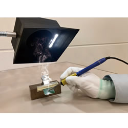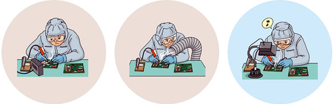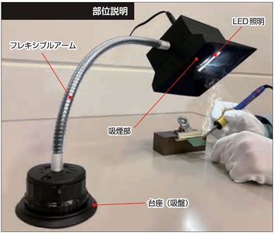 | はんだ付け作業時に発生するヒュームを吸引し、有害物質をフィルタで除去することで作業者の健康を守る装置です。 LED照明とフィルタ・小型ファンがついたスタンド式の縦型ハンダ吸煙機です。 現場作業者の使い勝手を追求して開発した便利な製品です。 ![]() ●ハンダ煙は上に舞い上がるため、横置きタイプと比較すると上部から確実に吸煙ができ、フード形状のため、煙を逃しません。 ●ダクト式の箱型吸煙装置と比較して省スペースなので、設置や管理が簡単です。 ●フレキシブルアームで、高さと角度が自由自在なので最適な場所で吸煙できます。 また空調によるハンダ煙の流れの変化にも柔軟に対応可能です。 ●台座は吸盤になっており、横置きでの使用や、壁面への固定も可能です。 ●LED照明の下で、明るい環境で作業ができるため、作業効率が上がります。 またセル生産(ハンダ・ねじ止め・検査など)にも便利です。 ●M812TF-200SEの電源は、単相AC220V仕様なので、海外の電源電圧に対応しています。 ■上部かの吸引 ハンダ煙は上に舞い上がるため、横置きタイプと比較すると上部から確実に吸煙ができ、フード形状のため、煙を逃しません。 ■フレキシブルアームの採用 高さと角度が自由自在なので最適な場所で吸煙できます。 また空調によるハンダ煙の流れの変化にも柔軟に対応可能です。 ■台座は吸引式 吸盤式のため壁面への固定も可能です。 ■特長 ●上部からの吸引とフード形状でハンダ煙を確実に吸引 上部吸引ハンダ煙は上に舞い上がるため、横置きタイプと比較すると上部から確実に吸煙ができ、フード形状のため、煙を逃しません。 ![]() ●フレキシブルアームの採用で高さと角度が自由自在 フレキシブルアームフレキシブルアームで、高さと角度が自由自在なので最適な場所で吸煙できます。 また空調によるハンダ煙の流れの変化にも柔軟に対応可能です ![]() ●台座は吸盤になっており、壁面への固定も可能 フレキシブルアーム台座は吸盤になっており壁面への固定も可能です。 吸煙部のみを横置きで使用することも可能です。 ![]() ●LED照明で作業効率向上 LED照明の下で、作業ができるため、作業効率が上がります。 またセル生産(ハンダ・ねじ止め・検査など)にも便利です ![]() ●小型・軽量・リーズナブルなため、内職の方への支給にもおすすめです。 ■使用場所