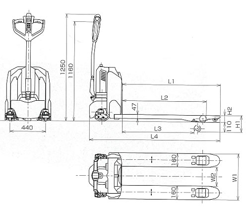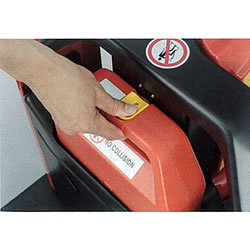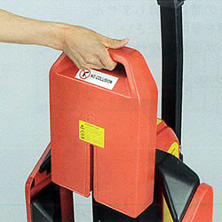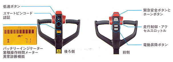 | 電動パレットトラック 積載荷重:1200kg・2000kg 電動走行、電動昇降 ![]() ■快適な操作を可能にしたスマートハンドル 人間工学に基づいたハンドル設計、グリップ部は長時間の作業を考慮したソフトで使い心地の良いデザイン。 ハンドルボタンは大きめに設計されており、手が届く位置にあるので手袋を着用していても簡単に操作できます。 液晶ディスプレイ付きピンコードパネルは高度な制御と操作を可能にします。 ![]() ■ハンドルはエアースプリングに支えられておりスムーズに元の位置に戻ります。 ![]() フォーク上昇時/下降時に最小旋回半径1400mm(M82NF-12LCT、M82NF-20LCT) フォーク上昇時/下降時に最小旋回半径1330mm(M82NF-12CT、M82NF-20CT) 小型デザインで小売店または、エレベーター内、オフィスなどの小スペースに最適です。 ■スマートリチウムバッテリー メンテナンスフリーリチウムバッテリーを装備。 充電器は急速充電機能があり、バッテリーのみの充電も可能です。 そのため、従来の電動パレットトラックと違いバッテリー管理・維持を手軽に行うことができます。 またバッテリー管理システム(BMS)は本バッテリーのパラメーターとパフォーマンスを最適に制御します。 ![]() ■バッテリーを取り外さなくても充電を可能にする充電差込口(充電ポート)。 急速充電機能があり作業の合間に充電できるため、作業時間を増やせます。 ![]() ■スマートバッテリーロックでバッテリーをしっかり安全に固定できる。 ![]() ■緊急停止ボタン ![]() ■補助車輪 ![]() ■寸法図(単位:mm) ![]()